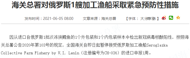 因从进口自俄罗斯1批次冻狭鳕鱼的1个外包装和1个内包装样本中检出新冠病毒核酸阳性,按照海关总署公告2020年第103号的规定,全国海关自即日起暂停接受俄罗斯加工渔船Seroglazka Collective Farm Fishery by V.I. Lenin(注册编号为CH-036)的进口申报1周。
