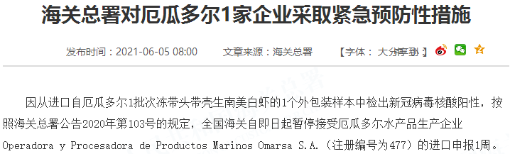因从进口自厄瓜多尔1批次冻带头带壳生南美白虾的1个外包装样本中检出新冠病毒核酸阳性,按照海关总署公告2020年第103号的规定,全国海关自即日起暂停接受厄瓜多尔水产品生产企业Operadora y Procesadora de Productos Marinos Omarsa S.A.(注册编号为477)的进口申报1周。