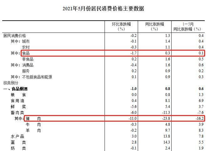 从同比看,CPI上涨1.3%,涨幅比上月扩大0.4个百分点,主要是去年价格变动的翘尾影响扩大所致。其中,食品价格由上月下降0.7%转为上涨0.3%,影响CPI上涨约0.05个百分点。食品中,猪肉价格下降23.8%,降幅比上月扩大2.4个百分点。