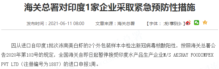 因从进口自印度1批次冻南美白虾的2个外包装样本中检出新冠病毒核酸阳性,按照海关总署公告2020年第103号的规定,全国海关自即日起暂停接受印度水产品生产企业M/S AKSHAY FOODIMPEX PVT LTD(注册编号为1887)的进口申报1周。