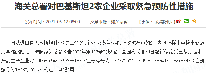 因从进口自巴基斯坦1批次冻章鱼的1个外包装样本和1批次冻墨鱼的2个内包装样本中检出新冠病毒核酸阳性,按照海关总署公告2020年第103号的规定,全国海关自即日起暂停接受巴基斯坦水产品生产企业M/S Maritime Fisheries(注册编号为T-445/2004)和M/s. Arsala Seafoods(注册编号为T-480/2005)的进口申报1周。
