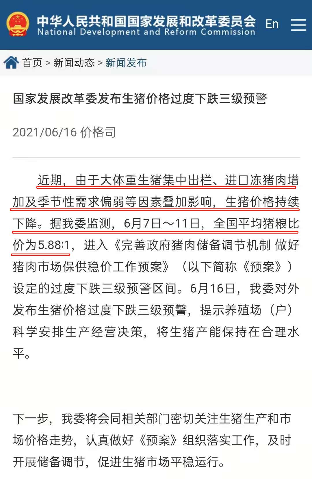 6月16日,据国家发展改革委监测,6月7日~11日,全国平均猪粮比价为5.88∶1,进入《预案》设定的过度下跌三级预警区间(低于6∶1)。