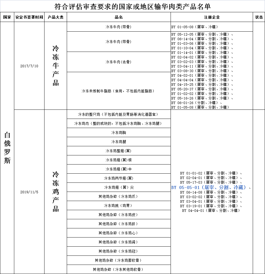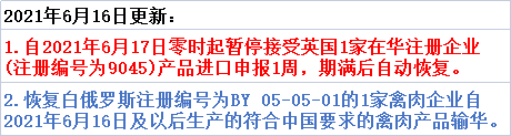 ⬆ 2.恢复白俄罗斯注册编号为BY 05-05-01的1家禽肉企业自2021年6月16日及以后生产的符合中国要求的禽肉产品输华。