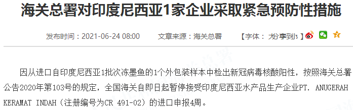 因从进口自印度尼西亚1批次冻墨鱼的1个外包装样本中检出新冠病毒核酸阳性,按照海关总署公告2020年第103号的规定,全国海关自即日起暂停接受印度尼西亚水产品生产企业PT. ANUGERAH KERAMAT INDAH(注册编号为CR 491-02)的进口申报4周。