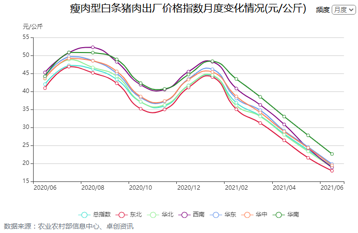 农业农村部对全国500个集贸市场监测数据显示,6月份第4周,全国生猪均价为13.76元/公斤,从1月份第3周的36.01元/公斤起,已连续22周下跌,累计跌幅达62%。6月份第4周,全国猪肉价格为24.60元/公斤,较1月份第3周下跌29.62元/公斤,累计跌幅达54.6%。相较于去年同期的41.57/公斤,猪肉价格已近腰斩。