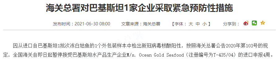 因从进口自巴基斯坦1批次冻白姑鱼的1个外包装样本中检出新冠病毒核酸阳性,按照海关总署公告2020年第103号的规定,全国海关自即日起暂停接受巴基斯坦水产品生产企业M/s. Ocean Gold Seafood(注册编号为T-435/04)的进口申报4周。