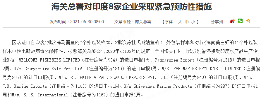 因从进口自印度1批次冻马面鱼的7个外包装样本、2批次冻杜氏叫姑鱼的2个外包装样本和8批次冻南美白虾的11个外包装样本中检出新冠病毒核酸阳性,按照海关总署公告2020年第103号的规定,全国海关自即日起分别暂停接受印度水产品生产企业M/s. WELLCOME FISHERIES LIMITED(注册编号为934)的进口申报1周、Padmashree Export(注册编号为1318)的进口申报2周、M/s. Suryamitra Exim Pvt. Ltd.(注册编号为1819)的进口申报1周、M/S. RVR MARINE PRODUCTS LIMITED(注册编号为805)的进口申报9周、M/s. ST. PETER & PAUL SEAFOOD EXPORTS PVT. LTD.(注册编号为840)的进口申报1周、M/s. J.M. Marine Exports(注册编号为1163)的进口申报1周、M/s Shivganga Marine Products(注册编号为287)的进口申报1周和M/s. S. S. International(注册编号为1162)的进口申报1周。