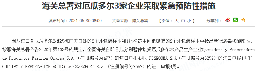 因从进口自厄瓜多尔2批次冻南美白虾的2个外包装样本和1批次冻中间低鳍鲳的2个外包装样本中检出新冠病毒核酸阳性,按照海关总署公告2020年第103号的规定,全国海关自即日起分别暂停接受厄瓜多尔水产品生产企业Operadora y Procesadora de Productos Marinos Omarsa S.A.(注册编号为477)的进口申报4周、PESKOREA S.A(注册编号为6252)的进口申报1周和CULTIVO Y EXPORTACION ACUICOLA CEAEXPORT S.A.(注册编号为7057)的进口申报4周。