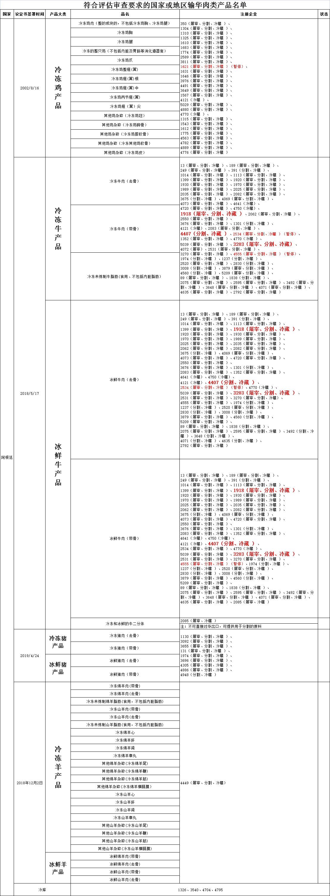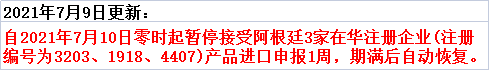 ⬆  自2021年7月10日零时起暂停接受阿根廷3家在华注册企业(注册编号为3203、1918、4407)产品进口申报1周,期满后自动恢复。