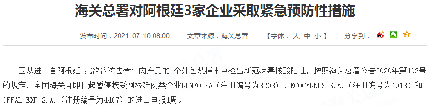 因从进口自阿根廷1批次冷冻去骨牛肉产品的1个外包装样本中检出新冠病毒核酸阳性,按照海关总署公告2020年第103号的规定,全国海关自即日起暂停接受阿根廷肉类企业RUNFO SA(注册编号为3203)、ECOCARNES S.A.(注册编号为1918)和OFFAL EXP S.A.(注册编号为4407)的进口申报1周。
