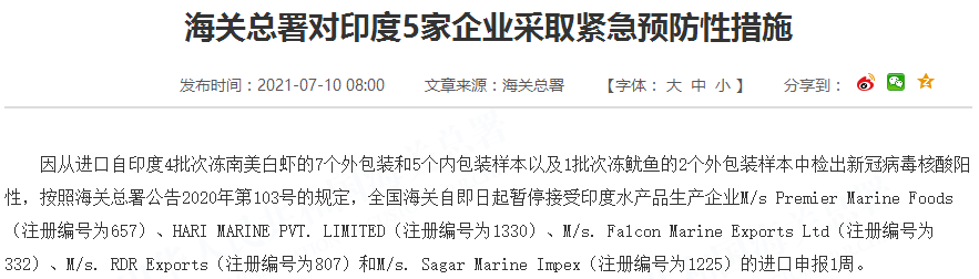 因从进口自印度4批次冻南美白虾的7个外包装和5个内包装样本以及1批次冻鱿鱼的2个外包装样本中检出新冠病毒核酸阳性,按照海关总署公告2020年第103号的规定,全国海关自即日起暂停接受印度水产品生产企业M/s Premier Marine Foods(注册编号为657)、HARI MARINE PVT. LIMITED(注册编号为1330)、M/s. Falcon Marine Exports Ltd(注册编号为332)、M/s. RDR Exports(注册编号为807)和M/s. Sagar Marine Impex(注册编号为1225)的进口申报1周。