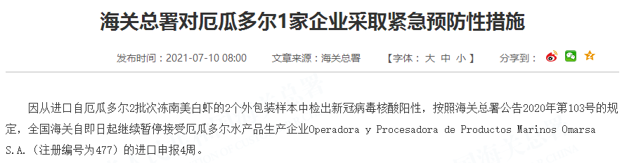 因从进口自厄瓜多尔2批次冻南美白虾的2个外包装样本中检出新冠病毒核酸阳性,按照海关总署公告2020年第103号的规定,全国海关自即日起继续暂停接受厄瓜多尔水产品生产企业Operadora y Procesadora de Productos Marinos Omarsa S.A.(注册编号为477)的进口申报4周。