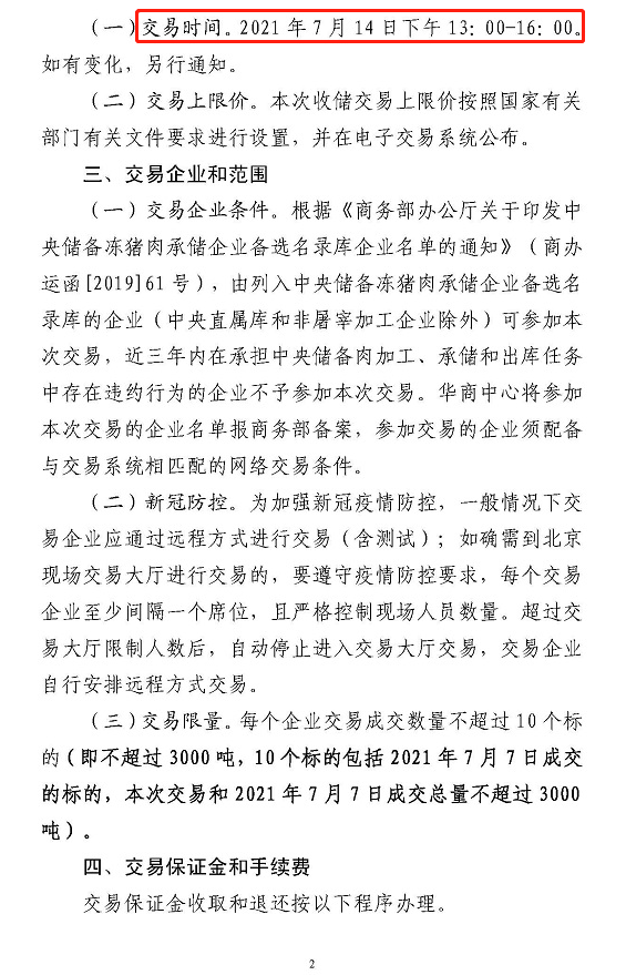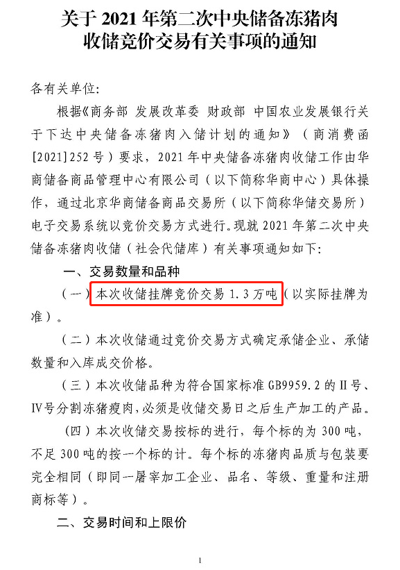 第一次收储刚刚结束,华储网就发布了第二轮收储通知,但收储量明显减少,对市场的实质支撑较为有限。挂牌竞价交易量为1.3万吨,交易时间为2021年7月14日下午13:00-16:00。收储通过竞价交易方式确定承储企业,承储数量和入库成交价格。通知还明确,本次收储品种为符合国家标准GB9959.2的II号、IV号分割冻猪瘦肉,必须是收储交易日之后生产加工的产品。收储交易按标的进行,每个标的为300吨,不足300吨的按一个标的计。