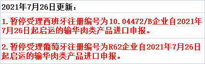 ⬆ 2.暂停受理葡萄牙注册编号为R62企业自2021年7月26日起启运的输华肉类产品进口申报。