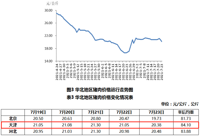本周华北地区猪肉价格环比下跌。周前期,生猪供应收紧,支撑生猪价格上涨;下游需求偏弱,猪肉价格涨幅较小。周后期因下游需求低迷,加之局部地区降雨天气影响猪肉销售,猪肉价格小幅下跌。