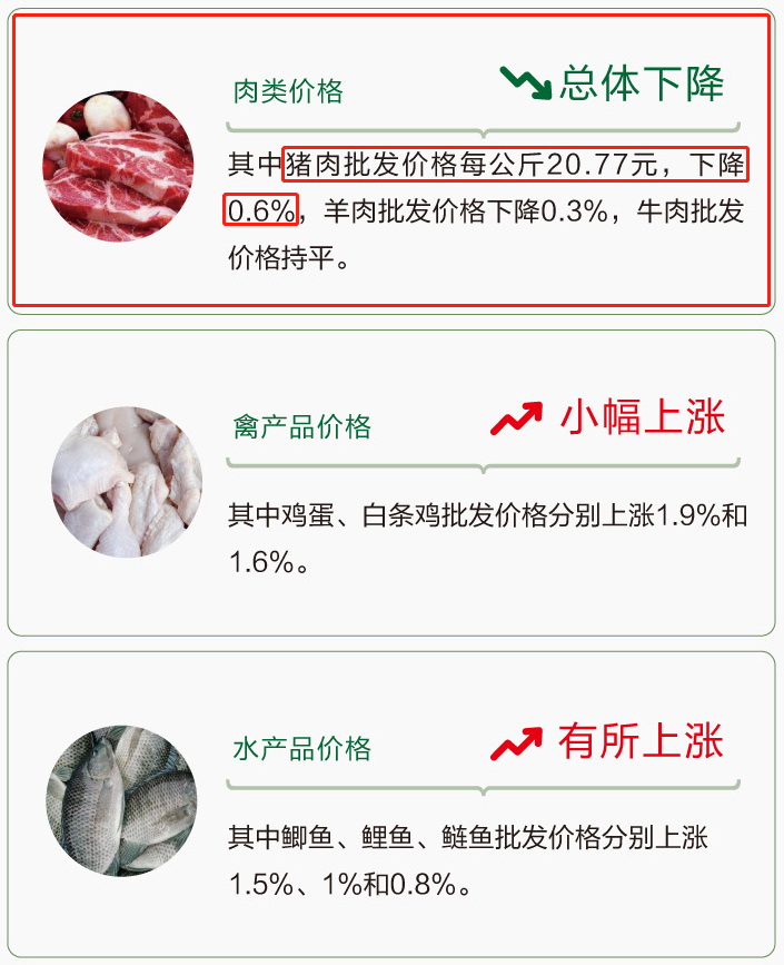 据商务部监测,7月19日至25日,全国食用农产品市场价格比前一周(下同)上涨0.6%,肉类价格总体下降,其中猪肉批发价格每公斤20.77元,下降0.6%,羊肉批发价格下降0.3%,牛肉批发价格持平。