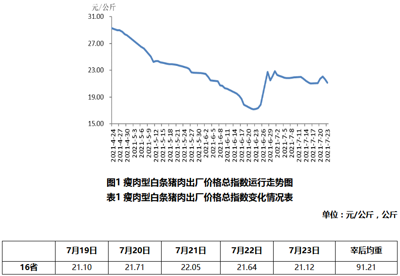 据农业农村部信息中心和山东卓创资讯股份有限公司联合监测,2021年第29周(即2021年7月19日-7月23日,以下简称本周),16省(直辖市)瘦肉型白条猪肉出厂价格总指数的周平均值为每公斤21.52元,环比小幅上涨0.3%,同比下跌56.0%,较上周收窄1.3个百分点。