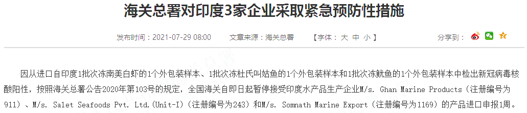 因从进口自印度1批次冻南美白虾的1个外包装样本、1批次冻杜氏叫姑鱼的1个外包装样本和1批次冻鱿鱼的1个外包装样本中检出新冠病毒核酸阳性,按照海关总署公告2020年第103号的规定,全国海关自即日起暂停接受印度水产品生产企业M/s. Ghan Marine Products(注册编号为911)、M/s. Salet Seafoods Pvt. Ltd.(Unit-I)(注册编号为243)和M/s. Somnath Marine Export(注册编号为1169)的产品进口申报1周。
