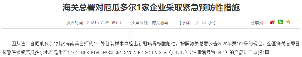 因从进口自厄瓜多尔1批次冻南美白虾的1个外包装样本中检出新冠病毒核酸阳性,按照海关总署公告2020年第103号的规定,全国海关自即日起暂停接受厄瓜多尔水产品生产企业INDUSTRIAL PESQUERA SANTA PRISCILA S.A.(J.T.M.)(注册编号为4251)的产品进口申报1周。