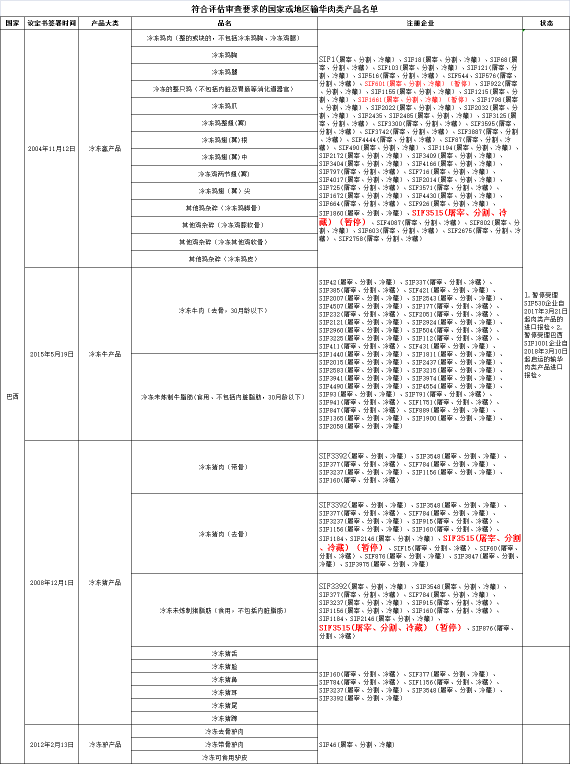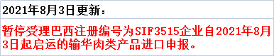 ⬆ 暂停受理巴西注册编号为SIF3515企业自2021年8月3日起启运的输华肉类产品进口申报。