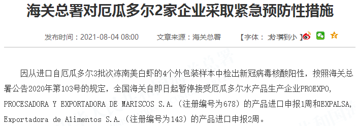 因从进口自厄瓜多尔3批次冻南美白虾的4个外包装样本中检出新冠病毒核酸阳性,按照海关总署公告2020年第103号的规定,全国海关自即日起暂停接受厄瓜多尔水产品生产企业PROEXPO, PROCESADORA Y EXPORTADORA DE MARISCOS S.A.(注册编号为678)的产品进口申报1周和EXPALSA, Exportadora de Alimentos S.A.(注册编号为143)的产品进口申报2周。