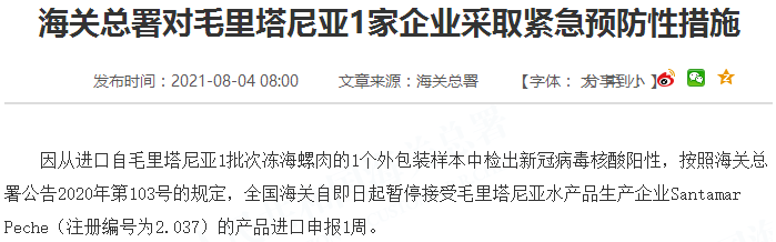 因从进口自毛里塔尼亚1批次冻海螺肉的1个外包装样本中检出新冠病毒核酸阳性,按照海关总署公告2020年第103号的规定,全国海关自即日起暂停接受毛里塔尼亚水产品生产企业Santamar Peche(注册编号为2.037)的产品进口申报1周。