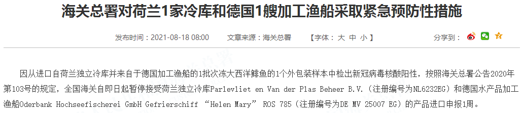 海关总署 | 对荷兰1家冷库和德国1艘加工渔船采取紧急预防性措施