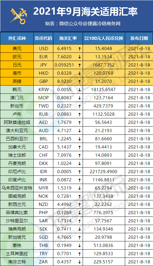 2021年8月海关汇率(对比)