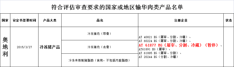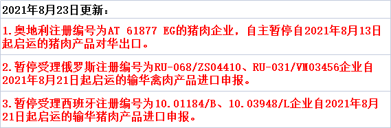 1.奥地利注册编号为AT 61877 EG的猪肉企业,自主暂停自2021年8月13日起启运的猪肉产品对华出口。