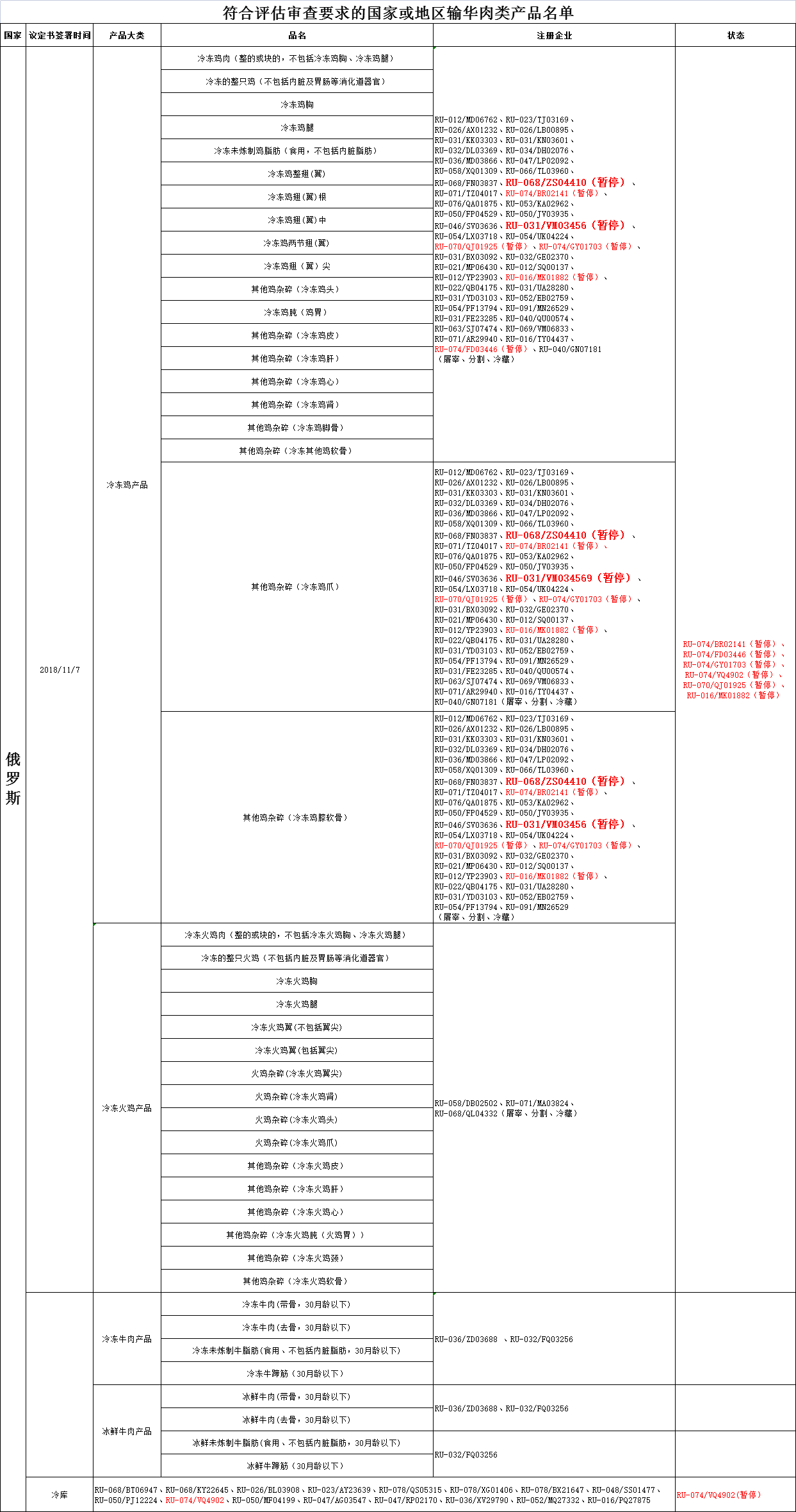 ⬆ 2.暂停受理俄罗斯注册编号为RU-068/ZS04410、RU-031/VM03456企业自2021年8月21日起启运的输华禽肉产品进口申报。