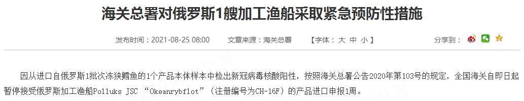 因从进口自俄罗斯1批次冻狭鳕鱼的1个产品本体样本中检出新冠病毒核酸阳性,按照海关总署公告2020年第103号的规定,全国海关自即日起暂停接受俄罗斯加工渔船Polluks JSC “Okeanrybflot”(注册编号为CH-16F)的产品进口申报1周。