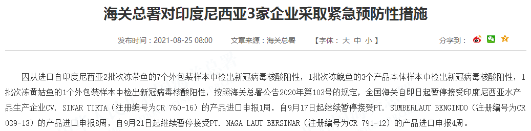 因从进口自印度尼西亚2批次冻带鱼的7个外包装样本中检出新冠病毒核酸阳性,1批次冻鮸鱼的3个产品本体样本中检出新冠病毒核酸阳性,1批次冻黄姑鱼的1个外包装样本中检出新冠病毒核酸阳性,按照海关总署公告2020年第103号的规定,全国海关自即日起暂停接受印度尼西亚水产品生产企业CV. SINAR TIRTA(注册编号为CR 760-16)的产品进口申报1周,自9月17日起继续暂停接受PT. SUMBERLAUT BENGINDO(注册编号为CR 039-13)的产品进口申报8周,自9月21日起继续暂停接受PT. NAGA LAUT BERSINAR(注册编号为CR 791-12)的产品进口申报4周。