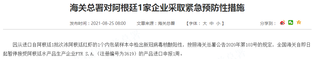 因从进口自阿根廷1批次冻阿根廷红虾的1个内包装样本中检出新冠病毒核酸阳性,按照海关总署公告2020年第103号的规定,全国海关自即日起暂停接受阿根廷水产品生产企业FYR S.A.(注册编号为3619)的产品进口申报1周。