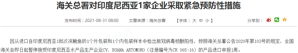 因从进口自印度尼西亚1批次冻鮸鱼的1个外包装和1个内包装样本中检出新冠病毒核酸阳性,按照海关总署公告2020年第103号的规定,全国海关自即日起暂停接受印度尼西亚水产品生产企业CV. BUANA ARTOMORO(注册编号为CR 065-16)的产品进口申报1周。