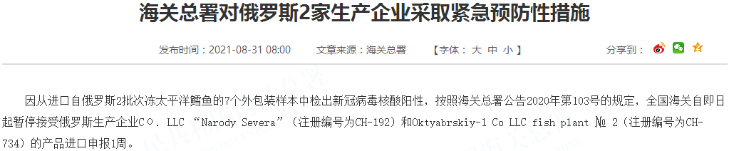 因从进口自俄罗斯2批次冻太平洋鳕鱼的7个外包装样本中检出新冠病毒核酸阳性,按照海关总署公告2020年第103号的规定,全国海关自即日起暂停接受俄罗斯生产企业Cо. LLC “Narody Severa”(注册编号为CH-192)和Oktyabrskiy-1 Co LLC fish plant № 2(注册编号为CH-734)的产品进口申报1周。