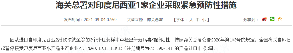 因从进口自印度尼西亚2批次冻鱿鱼等的3个外包装样本中检出新冠病毒核酸阳性,按照海关总署公告2020年第103号的规定,全国海关自即日起暂停接受印度尼西亚水产品生产企业PT. NAGA LAUT TIMUR(注册编号为CR 690-14)的产品进口申报2周。