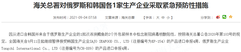 因从进口自韩国并来自于俄罗斯生产企业的1批次冻狭鳕鱼的2个外包装样本中检出新冠病毒核酸阳性,按照海关总署公告2020年第103号的规定,全国海关自9月11日起继续暂停接受韩国生产企业SAJO SEAFOOD CO., LTD(注册编号为KP-154)的产品进口申报4周,俄罗斯生产企业Tongchi International Co., LTD(注册编号为CH-889)的产品进口申报4周。