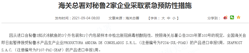 因从进口自秘鲁3批次冻鱿鱼的3个外包装和1个内包装样本中检出新冠病毒核酸阳性,按照海关总署公告2020年第103号的规定,全国海关自即日起暂停接受秘鲁水产品生产企业PRODUCTORA ANDINA DE CONGELADOS S.R.L.(注册编号为P234-SUL-POAD)的产品进口申报5周,SEAFROST S.A.C.(注册编号为P107-PAI-SEAF)的产品进口申报1周。