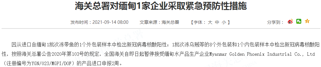 因从进口自缅甸1批次冻带鱼的1个外包装样本中检出新冠病毒核酸阳性;1批次冻乌贼等的8个外包装和1个内包装样本中检出新冠病毒核酸阳性,按照海关总署公告2020年第103号的规定,全国海关自即日起暂停接受缅甸水产品生产企业Myanmar Golden Phoenix Industrial Co., Ltd(注册编号为YGN/023/MGPI/DOF)的产品进口申报2周。