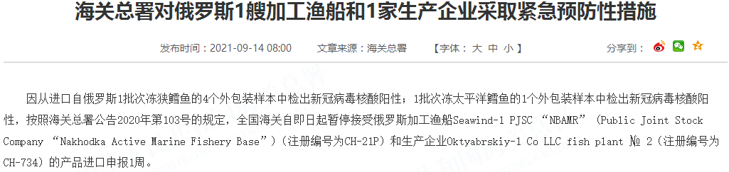因从进口自俄罗斯1批次冻狭鳕鱼的4个外包装样本中检出新冠病毒核酸阳性;1批次冻太平洋鳕鱼的1个外包装样本中检出新冠病毒核酸阳性,按照海关总署公告2020年第103号的规定,全国海关自即日起暂停接受俄罗斯加工渔船Seawind-1 PJSC “NBAMR” (Public Joint Stock Company “Nakhodka Active Marine Fishery Base”)(注册编号为CH-21P)和生产企业Oktyabrskiy-1 Co LLC fish plant № 2(注册编号为CH-734)的产品进口申报1周。