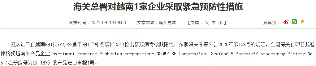 因从进口自越南的1批次小公鱼干的1个外包装样本中检出新冠病毒核酸阳性,按照海关总署公告2020年第103号的规定,全国海关自即日起暂停接受越南水产品企业Investment commerce fisheries corporation-INCOMFISH Corporation, Seafood & foodstuff processing factory No 5(注册编号为HK 187)的产品进口申报1周。