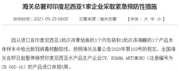 因从进口自印度尼西亚1批次冻黄姑鱼的1个内包装和1批次冻海鳗的1个产品本体样本中检出新冠病毒核酸阳性,按照海关总署公告2020年第103号的规定,全国海关自即日起暂停接受印度尼西亚水产品生产企业CV. BUANA ARTOMORO(注册编号为CR 065-16)的产品进口申报5周。