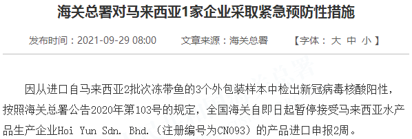 因从进口自马来西亚2批次冻带鱼的3个外包装样本中检出新冠病毒核酸阳性,按照海关总署公告2020年第103号的规定,全国海关自即日起暂停接受马来西亚水产品生产企业Hoi Yun Sdn. Bhd.(注册编号为CN093)的产品进口申报2周。