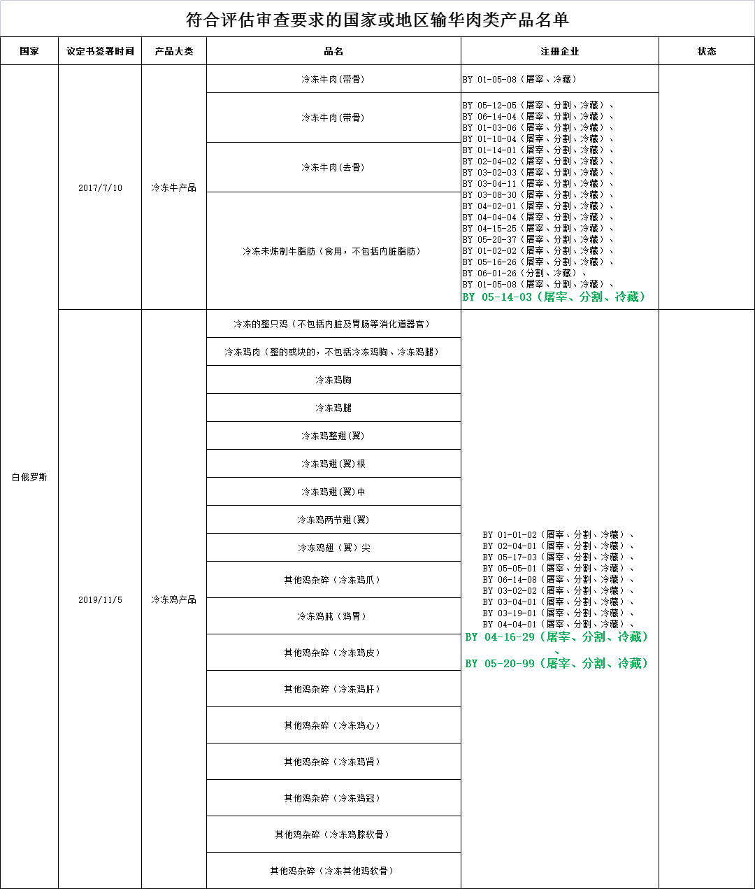 ⬆ 2.新增白俄罗斯3家禽肉、牛肉企业自2021年10月9日及以后生产的符合中国要求的肉类产品输华。