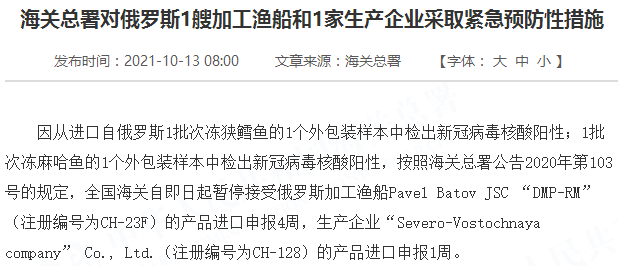 因从进口自俄罗斯1批次冻狭鳕鱼的1个外包装样本中检出新冠病毒核酸阳性;1批次冻麻哈鱼的1个外包装样本中检出新冠病毒核酸阳性,按照海关总署公告2020年第103号的规定,全国海关自即日起暂停接受俄罗斯加工渔船Pavel Batov JSC “DMP-RM”(注册编号为CH-23F)的产品进口申报4周,生产企业“Severo-Vostochnaya company” Co., Ltd.(注册编号为CH-128)的产品进口申报1周。