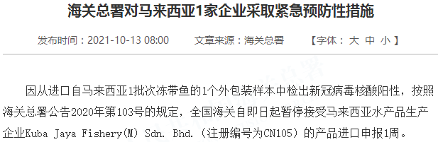因从进口自马来西亚1批次冻带鱼的1个外包装样本中检出新冠病毒核酸阳性,按照海关总署公告2020年第103号的规定,全国海关自即日起暂停接受马来西亚水产品生产企业Kuba Jaya Fishery(M) Sdn. Bhd.(注册编号为CN105)的产品进口申报1周。
