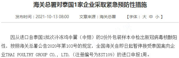 因从进口自泰国1批次冷冻鸡中翼(中翅)的2份外包装样本中检出新冠病毒核酸阳性,按照海关总署公告2020年第103号的规定,全国海关自即日起暂停接受泰国禽肉企业THAI POULTRY GROUP CO., LTD.(注册编号为EST109)的进口申报1周。
