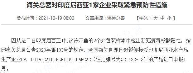 因从进口自印度尼西亚1批次冻带鱼的2个外包装样本中检出新冠病毒核酸阳性,按照海关总署公告2020年第103号的规定,全国海关自即日起暂停接受印度尼西亚水产品生产企业CV. DUTA RATU PERTIWI LANCAR(注册编号为CR 422-13)的产品进口申报1周。