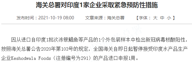 因从进口自印度1批次冻银鲳鱼等产品的1个外包装样本中检出新冠病毒核酸阳性,按照海关总署公告2020年第103号的规定,全国海关自即日起暂停接受印度水产品生产企业Keshodwala Foods(注册编号为291)的产品进口申报1周。