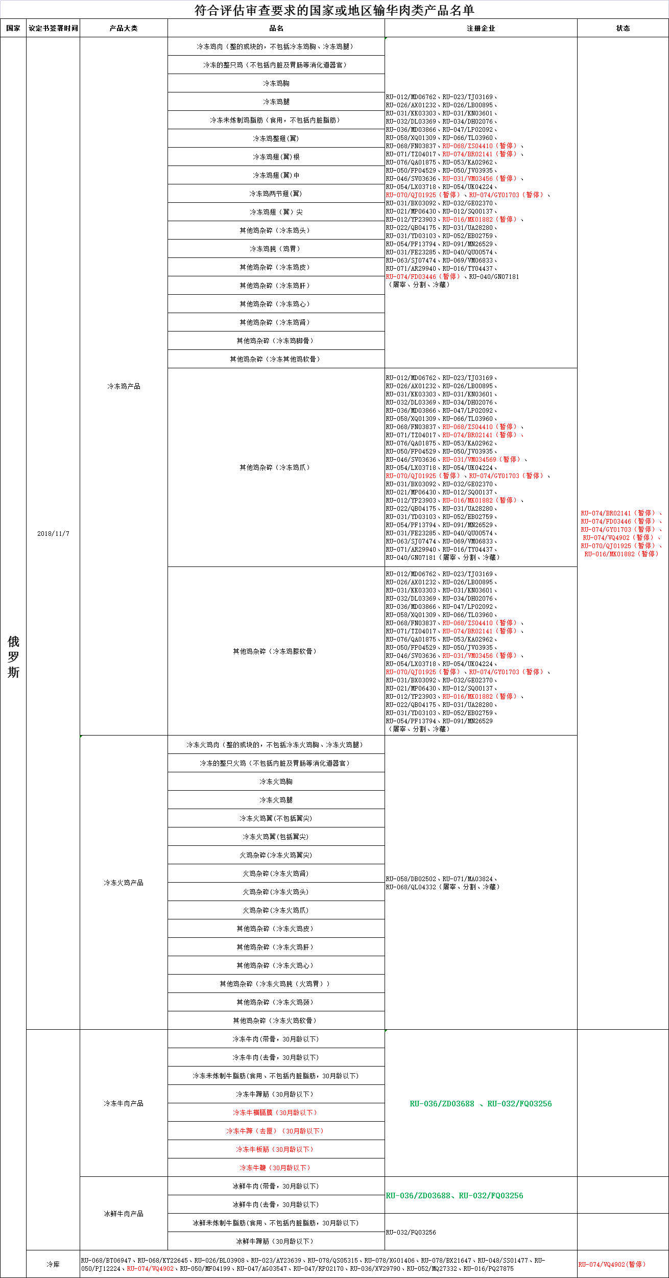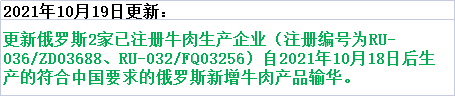 ⬆ 更新俄罗斯2家已注册牛肉生产企业(注册编号为RU-036/ZD03688、RU-032/FQ03256)自2021年10月18日后生产的符合中国要求的俄罗斯新增牛肉产品输华。